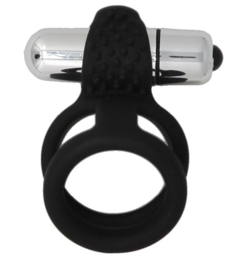 This soft and stretchy double-banded vibrating ring is sure to please both you and your partner! Thick silicone bands help maintain harder and stronger erections, while the powerful nubby vibrator is sure to thrill all the right spots on your partner. The single push button provides control with ease. This toy is sure to keep you going all night long.