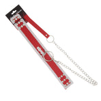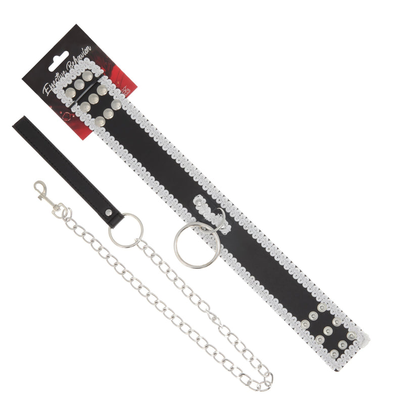 For your sexy bondage play, look the part in this bold feminine collar by 53X! The wide PVC band features a beautiful white lace detail that runs along the edges.  A single bondage D-ring is located at the front of the collar to attach the matching PVC leash. Easily adjust the collar to the desired fit with the nickel-free snaps and prepare for whatever the night may bring!