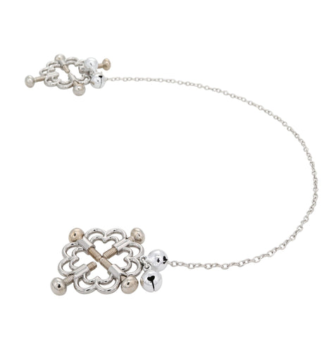 Add some fun to your sex life with this 4-Point Nipple Press with chain and bells. Heighten your nipple play with a simple twist of the screws. Tighten the screws to exactly the pressure you desire, and pull on the chain for a satisfying tugging sensation with the bells ringing with pleasure.