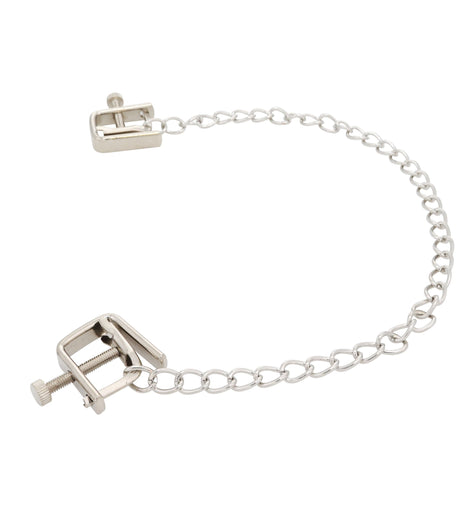 Vice grip style clamps keep your nipples erect and your body aroused! The adjustable vice applies pressure to your nipples with a slight turn of a screw, escalating the tension when desired. With the connected chain applying the right amount of pull on your nipples, you will feel increased stimulation with every move! Have your partner lightly tug on the chain for some added control and kink in the bedroom! Perfect for nipple play beginners or for those wanting to add something to their bondage repertoire.