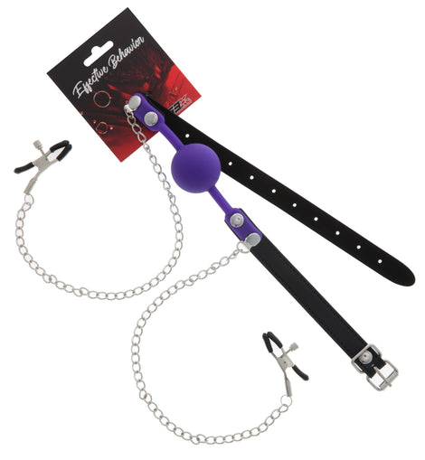 Fulfill extreme fantasies with this 53X gag restraint! The gag itself is a silica ball with a extended flexible cords on either side to provide additional comfort to the wearer. Adjustable PVC straps are fastened behind with a buckle for easy dress-up and removal. Lastly, two chains hang from the band with an adjustable nipple clamp at each end for extra kinky arousal!