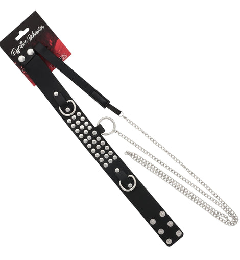 For your sexy bondage play, look the part in this riveted collar by 53X! The faux leather collar features four rows of flat rivets sandwiched between two D-rings and above a 1.25" O-ring with an attached 48" matching chain leash. Adjust the collar to the desired fit with the nickel-free snaps and prepare for whatever the night may bring!