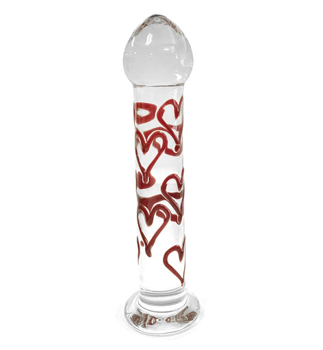 The L-21 Clear/Red glass massager features a sleek, curved end designed for targeted stimulation. Measuring 7 inches in total length with a widest diameter of 1 inch, it offers precise control and comfortable use. Crafted from durable glass, this massager is easy to clean and ideal for those seeking a smooth, firm, and hygienic experience.