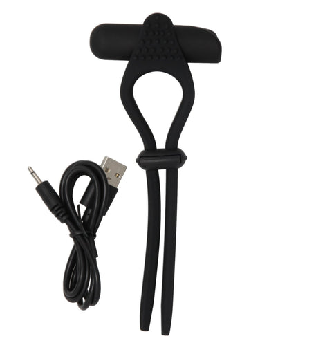 Enhance your pleasure experiences with improved-upon designs like the Bullseye vibrating constriction lasso! Completely adjustable, simply tighten the ring by pulling the "tails" through the plastic push-lock. The removable bullet vibrator provides 10 vibration patterns and is inserted into a tunnel running through the upper textured surface!