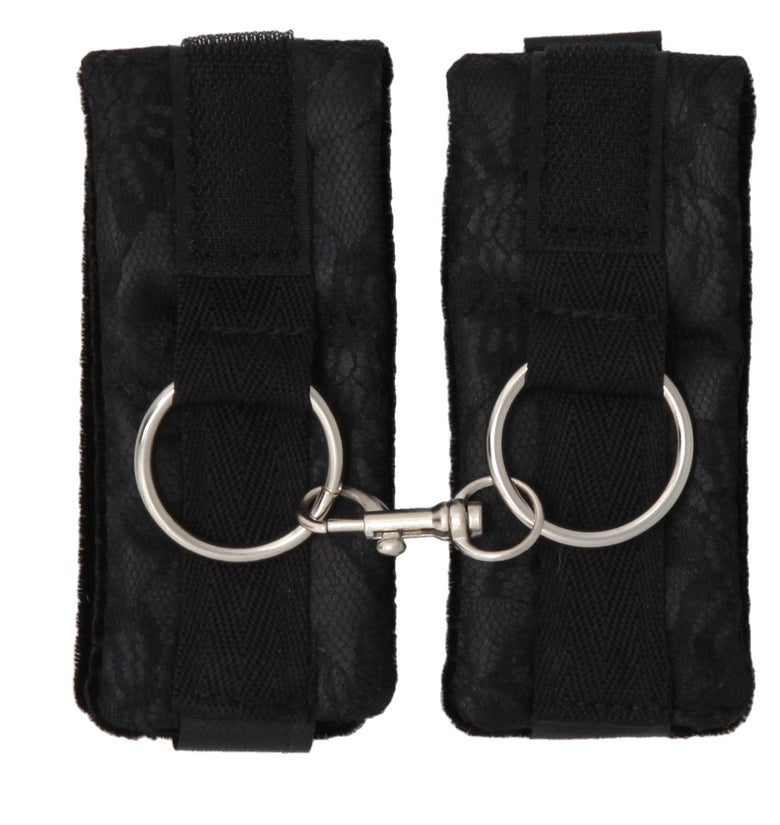 Submit in style with these elegant lace cuffs that will surely have you begging for more! Whether told to or not. The soft plush inside provides a comfortable restraint; while the heavy-duty material allows for a hardcore play. The hook and loop straps make these cuffs easy to adjust for beginner to advanced users! A universal clasp allows your partner to add other restraints and bind you in many different fashions. Live out your ultimate fantasies with these sensual lace cuffs.