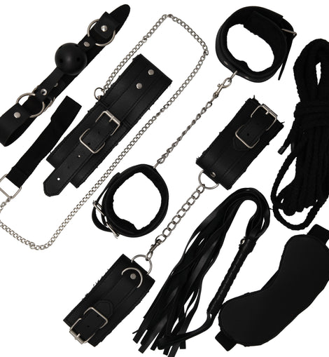 This kit has everything you’d need to fulfill a night of BDSM fantasies! Intensify the senses with the blindfold, slap and tickle with the flogger, bind your partner into all of your favorite positions with the rope and both ankle and wrist cuffs. Cut down the talking back with the breathable ball gag, and escort your partner wherever you want with the collar and leash set. The options are endless with this full kit of kink!