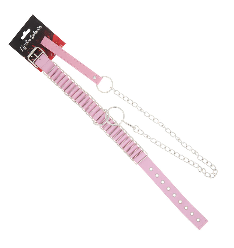 This collar is perfect for heavyweight bondage fans! Featuring faux leather braided between a row of small, rectangular metal loops for a unique, bordered look and a comfortable, weighted fit. The neck features a D-ring with the faux leather wrapped through for a sturdy attachment, and a large O-ring. Included is a matching chain leash to attach to the O-ring.