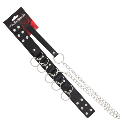 Live out your bondage fantasies with this premium faux leather bondage collar by 53X! Five separate double rings span over the front and sides of the collar in the classic bondage fashion, accented with gleaming studded rivets. Attach the included matching leash and any additional bondage accouterments you wish to the available rings. Easily adjust the collar to the desired fit with the nickel-free snaps and prepare for whatever the night may bring!
