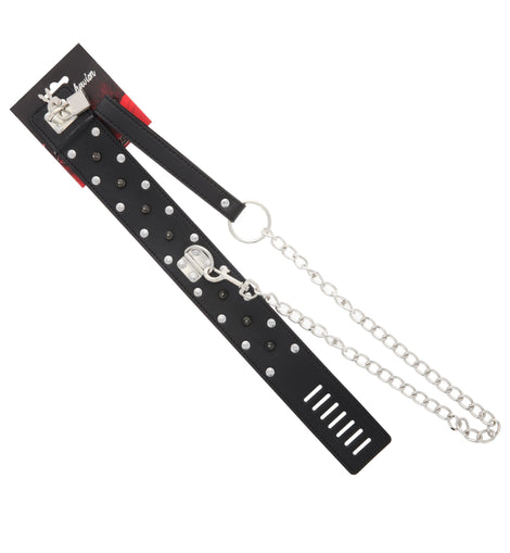 Step up  the traditional bdsm game with this quality leather spiked collar, featuring 7 spikes and 18 studs that run the length of the collar around the neck. The 1.5" D-ring in the front make it easy to attach the matching leash. Easily secure the included Gasp latch style lock, not only is this a quality collar but also a fashion statement.