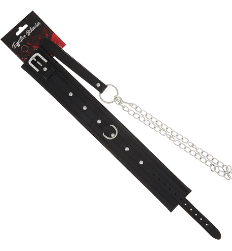Live out your bondage fantasies with this premium faux leather bondage collar by 53X! The collar is made of three layered PVC panels, connected with gleaming round rivets. The back fastens with the adjustable buckle strap for a true fit. A single bondage D-ring is located at the front of the collar to attach the matching PVC and chain leash.