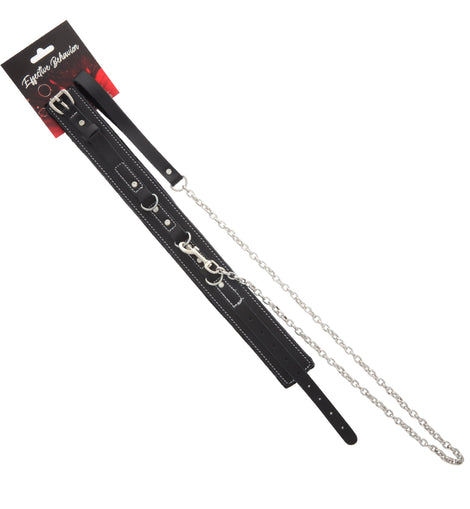 Live out your bondage fantasies with this premium faux leather bondage collar by 53X! The collar is made of two layered PVC panels, connected with gleaming round rivets and adorned with sparkling faux diamonds. The back fastens with the adjustable buckle strap for a true fit. Three bondage D-rings are located at the front of the collar to attach the matching chain leash and any additional bondage accouterments you wish to the available rings.