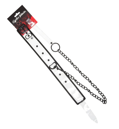 Step up your traditional BDSM game with this clear riveted collar. The comfortable slender band comes with 10 adjustment holes to ensure a snug fit, and features a nickel-free D-ring in the front to attach the matching chain leash.