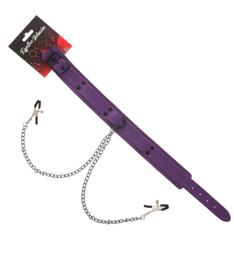 Get extreme with this effective behavior collar by 53X! Made of genuine leather and accented with black metal rivets, this purple collar has a wide comfort panel with outer buckling strap. Hanging from the center D-ring are two adjustable nipple clamps connected with chains, taking your kinky play to a whole new level.