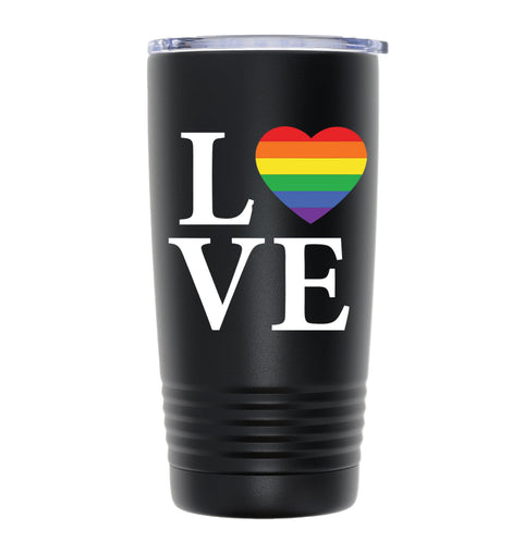This 20oz black tumbler features a sleek design with the phrase "I LOVE" prominently displayed in white, where the "O" is uniquely colored in the vibrant hues of the rainbow flag. Crafted for durability and style, it’s perfect for showing support for the LGBTQ+ community while keeping your beverages at the ideal temperature throughout the day.