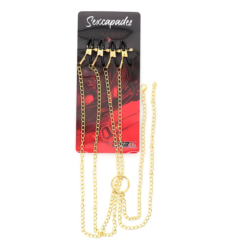 Elevate intimate moments with the SEXCAPADES Body Chain featuring gold-finished nipple and labia clamps. Designed for precise, adjustable pressure, this accessory enhances sensation while adding a luxurious aesthetic. Crafted to combine comfort with control, it offers an expert touch to explore new levels of pleasure and connection.