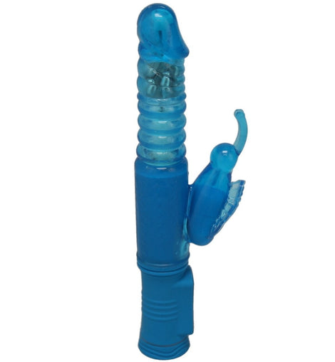 Our Thrusting Rabbit Vibe with Inner Beads wants to play, tempting you with a thrusting shaft containing rotating pleasure beads for maximum stimulation. Feel the butterfly dance and tickle against your clitoris as you switch rotation with the press of the round center button! Explore both right and left up arrow buttons to find the right vibration mode for you, or use either down arrow button to lessen intensity. The Butterfly Tickler is splash-proof for some extra steamy shower-play.  Charge it with the included USB charging cable that you can plug in almost anywhere!
